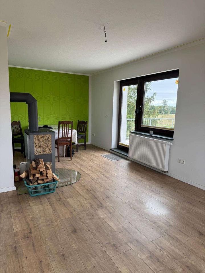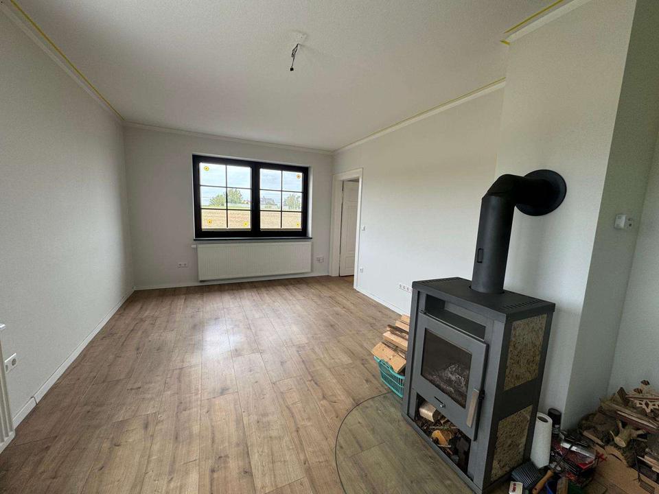 Über eine Holztreppe erreicht man das Obergeschoss und somit die eigentliche Wohnetage. Hier befindet sich das große, helle Wohnzimmer, in welchem ein Kamin an kalten Tagen für wohlige Wärme sorgt, sowie direkter Zugang zur Terrasse besteht. Lassen Sie von hier aus Ihren Blick über die weite Natur. schweifen. Weiterhin befindet sich im Obergeschoss ein großes Zimmer mit einem angrenzenden kleineren Zimmer. Dieser Bereich lässt sich ideal als Schlafzimmer mit Ankleidezimmer nutzen. Im Obergeschoss befindet sich auch ein separates WC sowie ein weiteres Bad mit großer Dusche und Waschtisch.