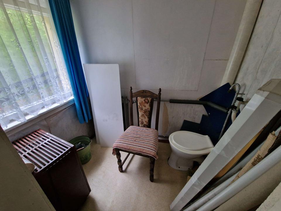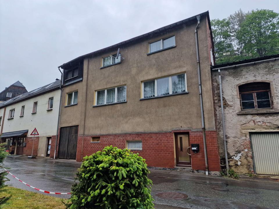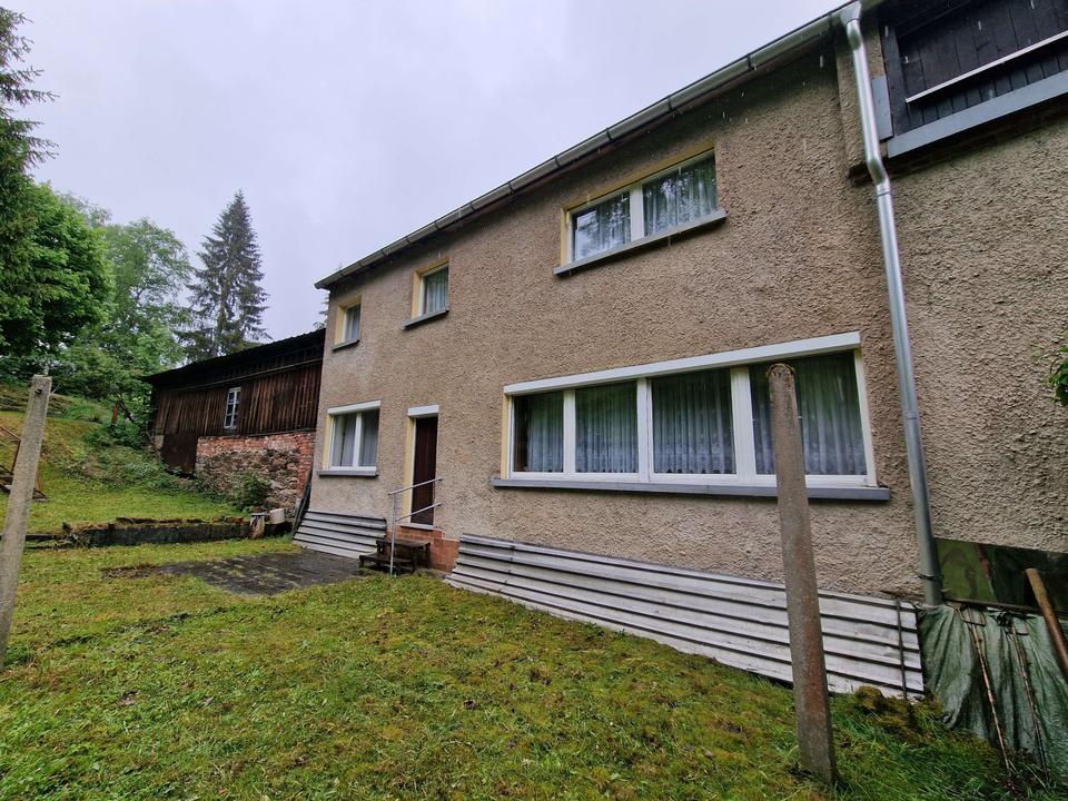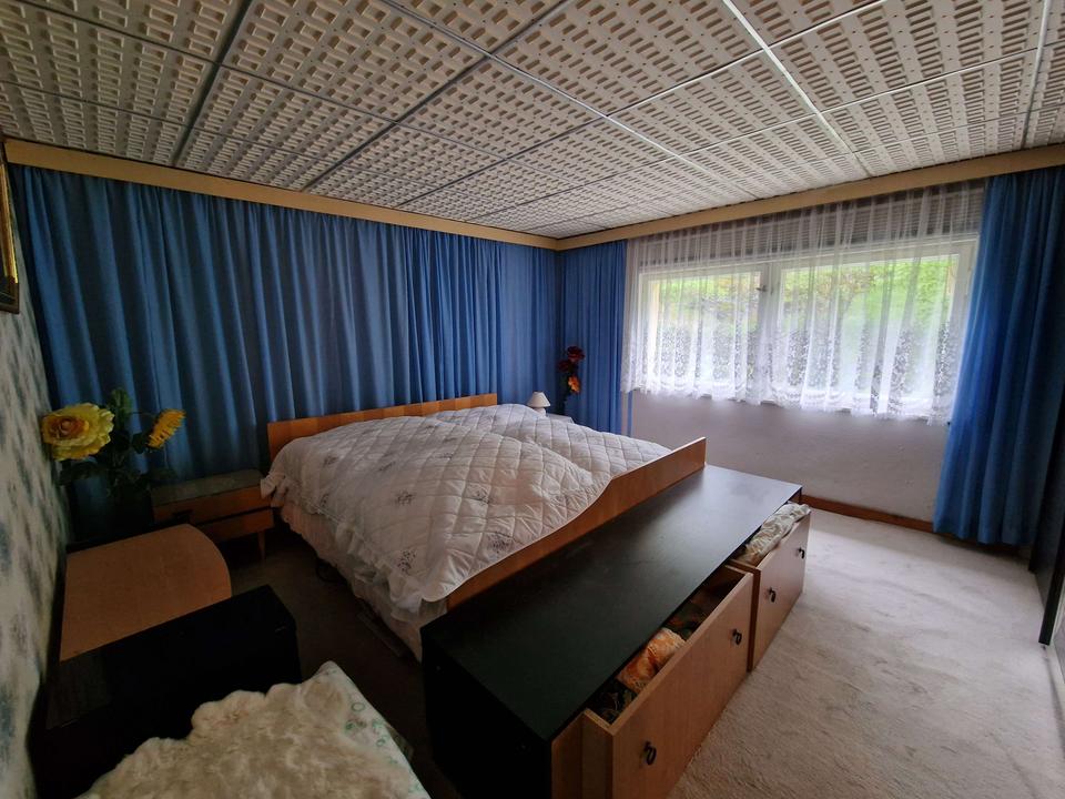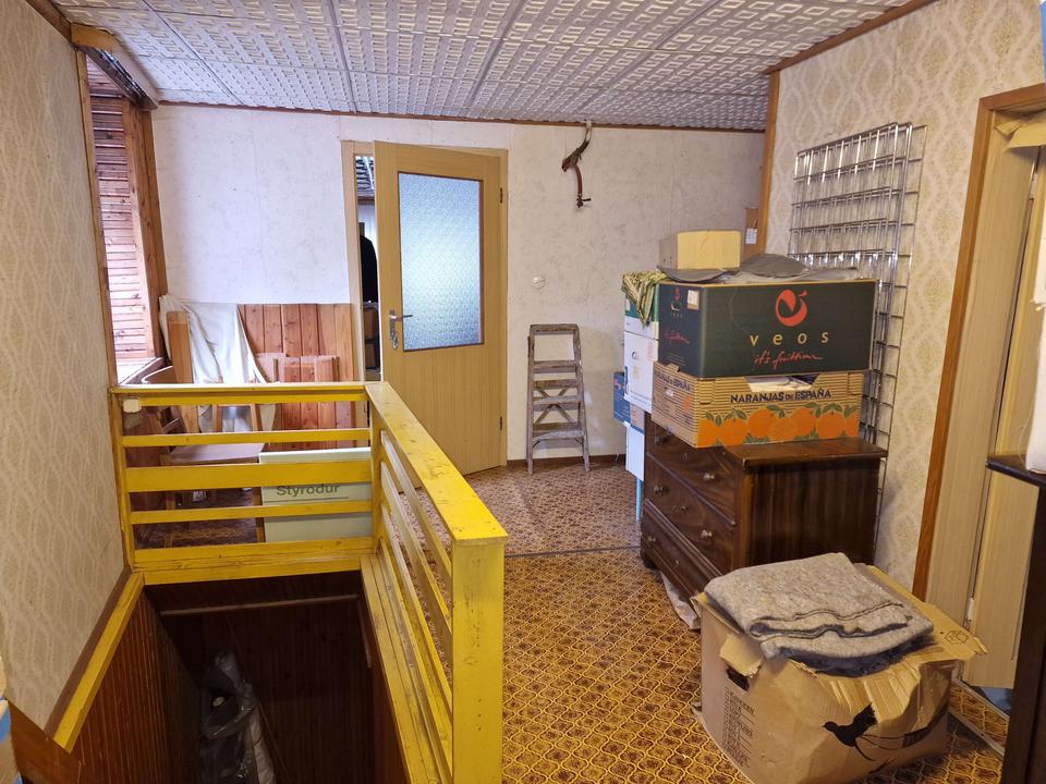 Man betritt das Haus im Erdgeschoss, welches im hinteren Teil unter der Erde ist und somit teils Erd- teils Kellergeschoss ist. Diese Etage dient mehr als Wirtschafts- bzw. Abstelletage, mehrere Kellerräume für das Lagern von Holz oder Gartengeräten etc. sowie eine große Garage sind hier vorhanden. Über eine Treppe erreicht man das Obergeschoss, hier befindet sich ein großer Wohnbereich mit offener Küche, ein Badezimmer, sowie drei weitere Räume. Im ausgebauten Dachgeschoss befinden sich ebenfalls nochmal 3 Räume und ein Badezimmer. Das Haus ist derzeit nicht mehr bewohnt und dient nur noch zu Abstellzwecken, alle Räume können individuell als Schlaf-, Kinder- oder Arbeitszimmer gestaltet werden, je nachdem wie gebraucht und gewünscht ist. Das Haus befindet sich in einem ordentlich zustand, jedoch nicht mehr auf dem heutigen Standard, Erneuerung der Elektroleitungen, sowie der Fenster und Innenausbau ist hier notwendig. Ebenfalls wird das Haus derzeit nur über Öfen beheizt und per Boiler erfolgt die Warmwasseraufbereitung. Es ist also die Installation eines Heizungssystems notwendig.